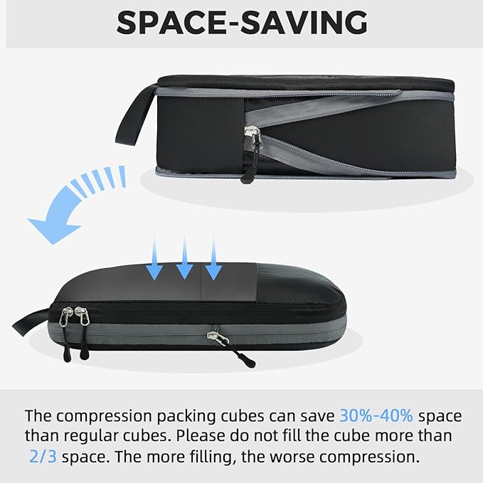 • Space Saving: Save up to 50% space by compressing the packing cubes via the exterior compression zippers; And all the zippers we use are SBS zippers, it makes sure the packing organizers could be opened and closed easily