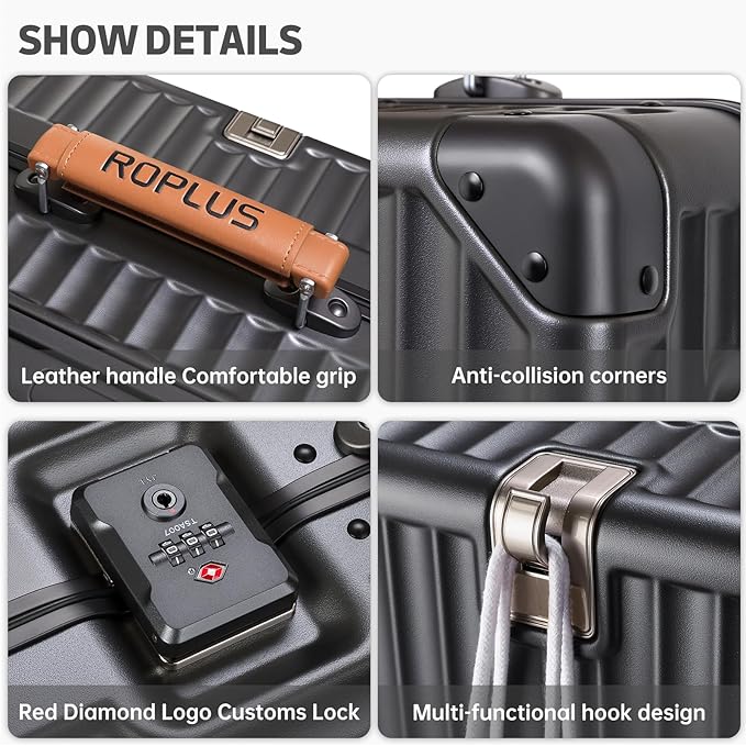 - HUMANIZATION DESIGN: The top handle and side handles of this roller suitcase are made of leather with labor-saving cushioning design to provide the most comfortable lifting experience. And this suitcase is equipped with metal hooks to free your hands