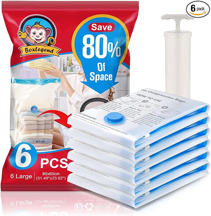 BoxLegend Vacuum Storage Bags with Hand Pump 6 Large 23.6’’x31.5’’ Thickened Vacuum Seal Bags for Clothing Coat Bedding Quilt Blanket Pillow Comforters