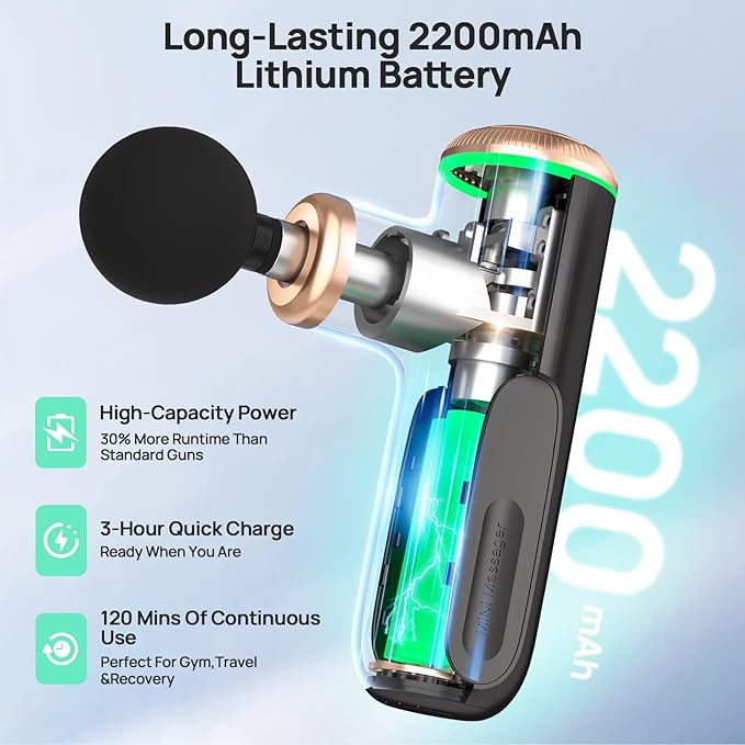 - 【Ultra-Superior 3C Power Battery】This handled muscle massager gun is specially equipped with 3C Power Battery. Compared with other products, it has 3X discharge rate for power supply and 5X battery cycle life. At the same time, 800mAh battery capacity allows it to be used continuously for 5-7 hours.