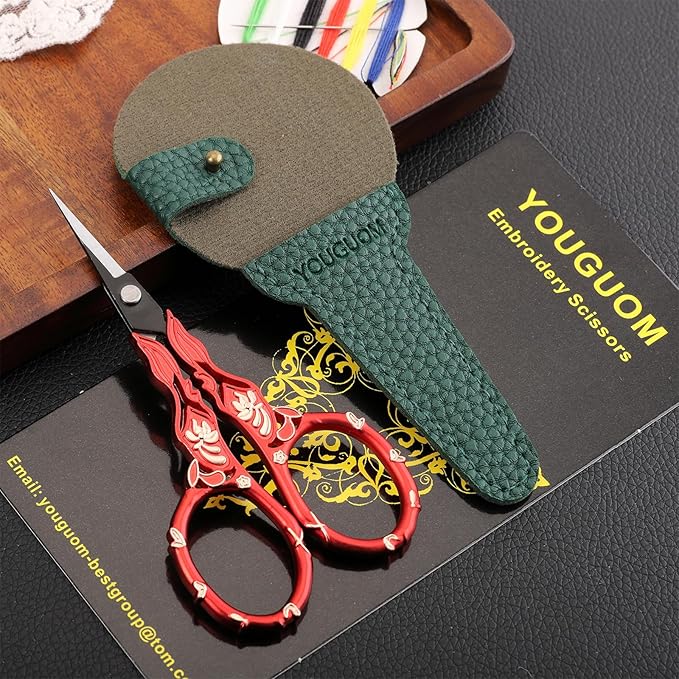 Antique Embroidery Scissors with Case, Needlework Scissors for Sewing Crafting Cross Stitch Crochet Yarn, Detail Shears Threading Snips Vintage Golden Red