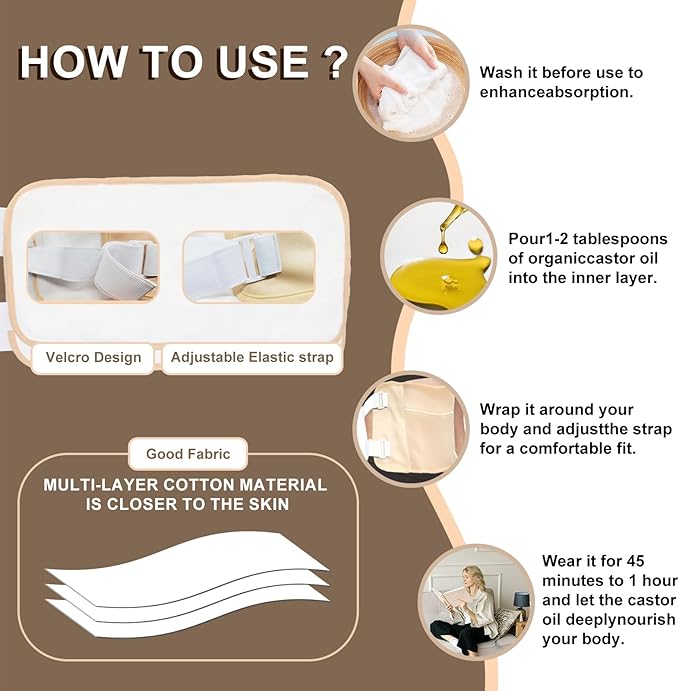 - 🧰【ALL-IN-ONE STARTER KIT FOR NATURAL DETOX】Includes 4 ergonomic wraps (liver, 2x breast, 1x neck) and 60ml cold-pressed organic castor oil. Thoughtfully curated for women and beginners—no confusing add-ons, just the essentials to begin your castor oil therapy routine with ease.