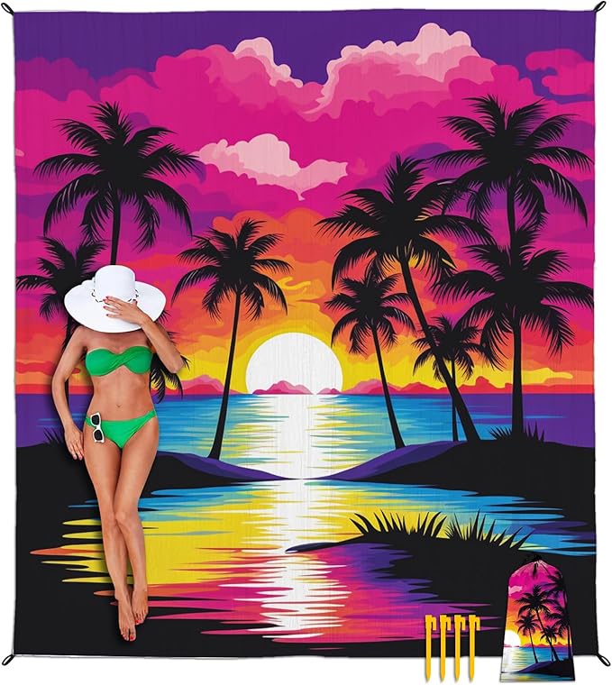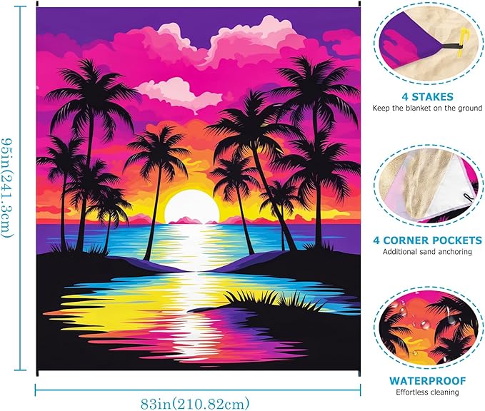 - Beach Accessories: This beach blanket set includes 1 beach mat, 4 stakes and 1 storage bag. Each corner of the blanket has a pocket where you can put sand and hold the blanket to the ground with stakes, effectively preventing it from shaking