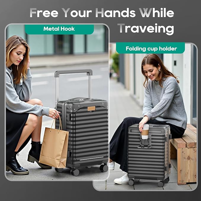 - Multi-functional Smart luggage: Built-in USB port for charging your computer or cell phone to stay charged while traveling. Folding cup holder and hook let you free your hands and avoid carrying extra items.