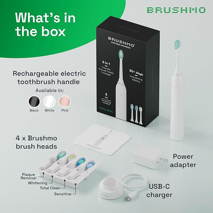 - What’s Inside the Box: 1 rechargeable electric toothbrush handle, 4 click-on Brushmo brush heads (Plaque Control, Whitening, Gum Care Sensitive, and Total Clean), and a USB type-C charger with a power adapter.