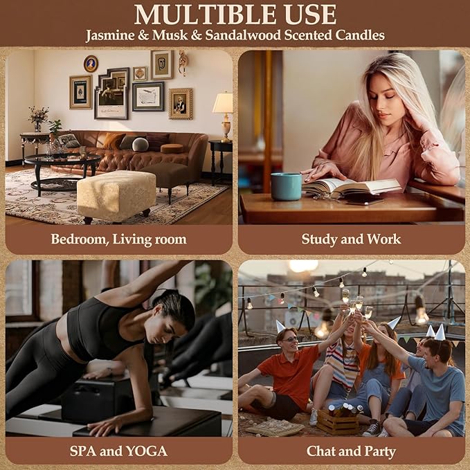 - Premium 8% Essential Oils for Strong Aromatherapy Infused with 8% high-concentration essential oils, this Jasmine, Musk & Sandalwood candle set delivers a smoke-free, long-lasting fragrance to enhance relaxation during yoga, meditation, or spa sessions. Perfect for creating a calming atmosphere at home or gifting to loved ones.