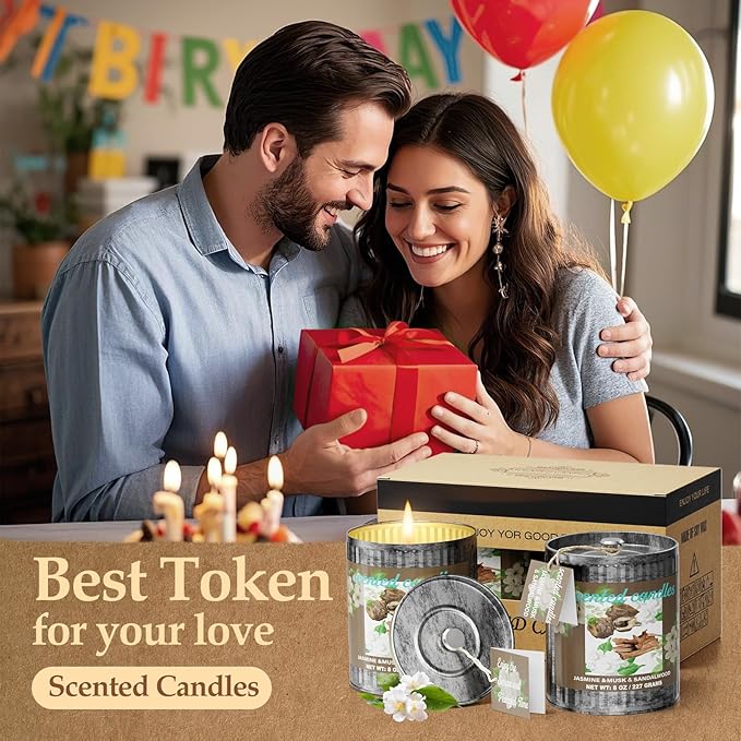 Jasmine&Musk&Sandalwood Scented Candle Set | 2Pack 16oz 80H Burn Time,8% Essential Oils | Smoke-Free Pure Soy Wax | Aromatherapy for Relaxing,Yoga Meditation Spa,Gift Set for Men/Women/Father's Day