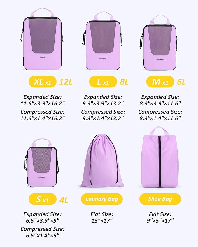 • Compression Packing Cubes - Are you fed up with the travel kind of messy suitcase? Travel with BAGSMART PACKING CUBES and they make a world of difference. The 6-piece packing cubes contains 4 travel cubes + 1 laundry bag + 1 shoe bag, keeps your outfits in separate compression cubes, and makes your luggage clean and neat while traveling