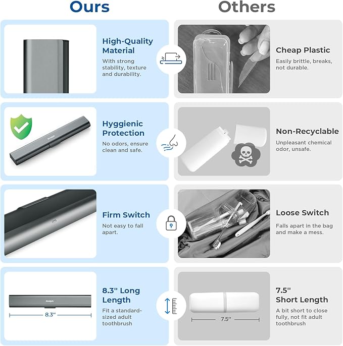 - High-Quality Material: Made of food-grade durable aluminum alloy, our travel toothbrush case is safe, non-toxic, odorless, and rust-free. Say goodbye to the common problem of the brittleness of plastic, as our toothbrush container stands the test of time with its robust build. Ensures your toothbrush stays clean and safe