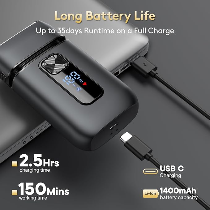 - Up to 150 Min Runtime & Smart Digital Display & USB C Fast Charging: The led power level indicator exactly shows the amount of time left on the 18650 lithium ion battery without worrying about it running out mid-shave. mens electric shavers for face allows for 150 mins of continuous run time on a single 1.5 hrs charge.