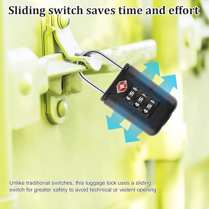 - [Enduring Stainless Steel] TSA approved luggage locks are made of plastic and stainless steel for greater endurance and resistance. Unlike traditional switches, these luggage locks use a slide switch for greater security to avoid technical or violent opening.