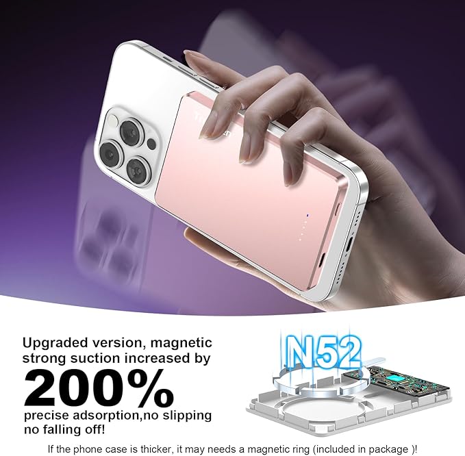 - [Smart Temperature Control] :Equipped with advanced temperature management, this for for magsafe battery pack utilizes NTC intelligent temperature control to ensure safety during charging. The system automatically adjusts the output to prevent overheating, keeping both your devices and the external charger for iPhone secure while using the USB-C fast charging connection. Ideal for beach vacation essentials, this small chager delivers iPhone fast charging speeds even in tropical climates. Pocket-sized but packed with 5000mAh juice—enough to revive your Phone