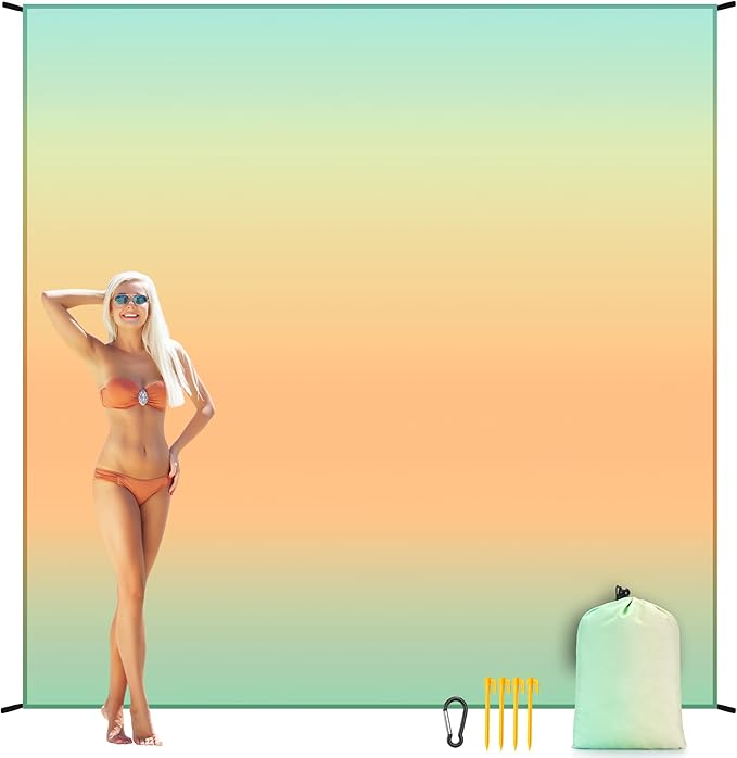- 【Waterproof and Sandproof】Made from durable nylon, this quick-drying mat repels sand. Shake it off to remove debris. Each corner has pockets for sand or rocks, and included stakes keep it anchored.