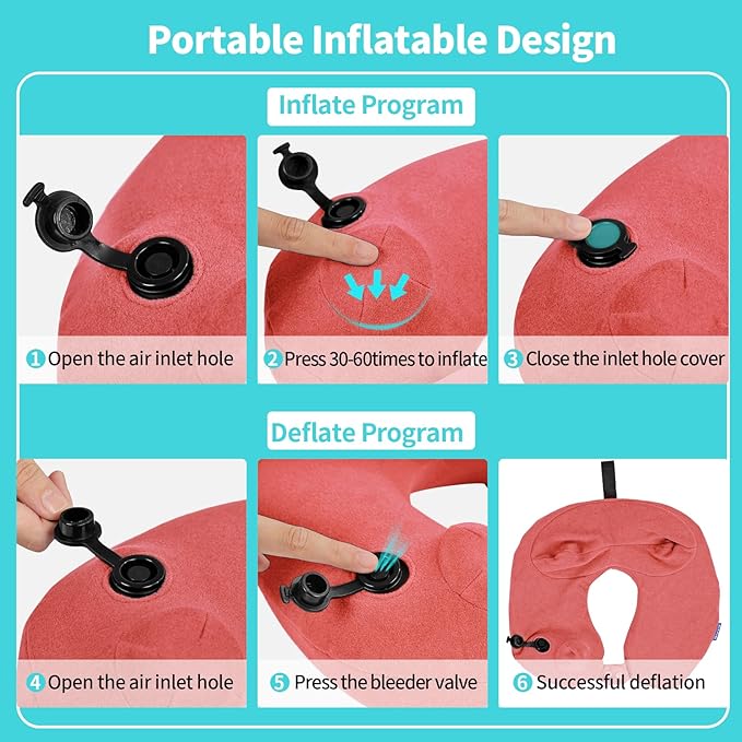 - 【Effortless Inflation – No Blowing Required】Simply press the built-in pump repeatedly until you reach your desired firmness—no need to blow into it. Deflation is just as quick, taking only 10-20 seconds to flatten and store. The adjustable front clasp allows you to customize the fit, making it suitable for travelers of all sizes.
