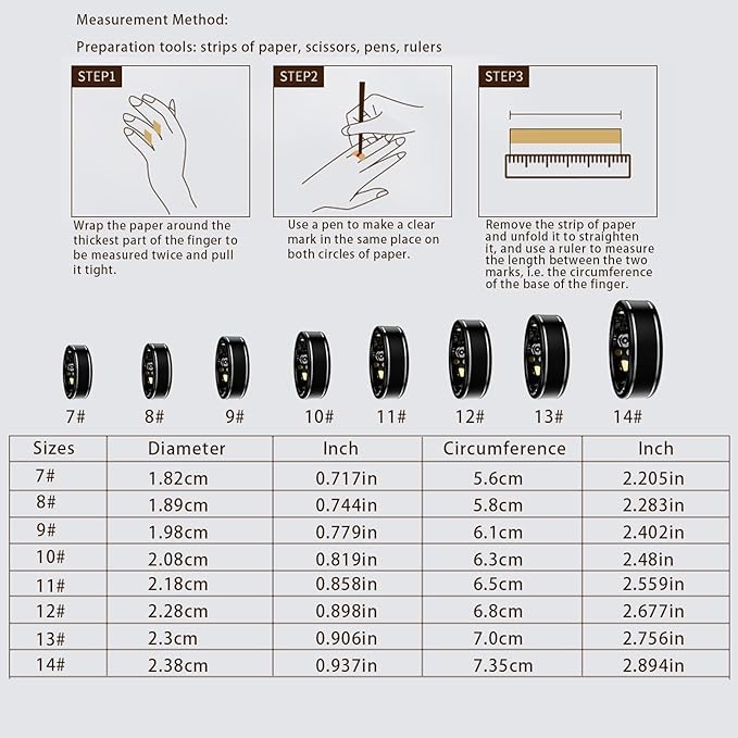 - 【Select the Right Size】: Before purchasing the Anarow smart health ring, please refer to our detailed size chart and measure your finger circumference to ensure the most accurate and comfortable fit. The health ring is available in 8 sizes (non-adjustable), designed for all-day wear with a sleek, secure fit. If between sizes, choose the larger one for comfort and more stable sensor contact