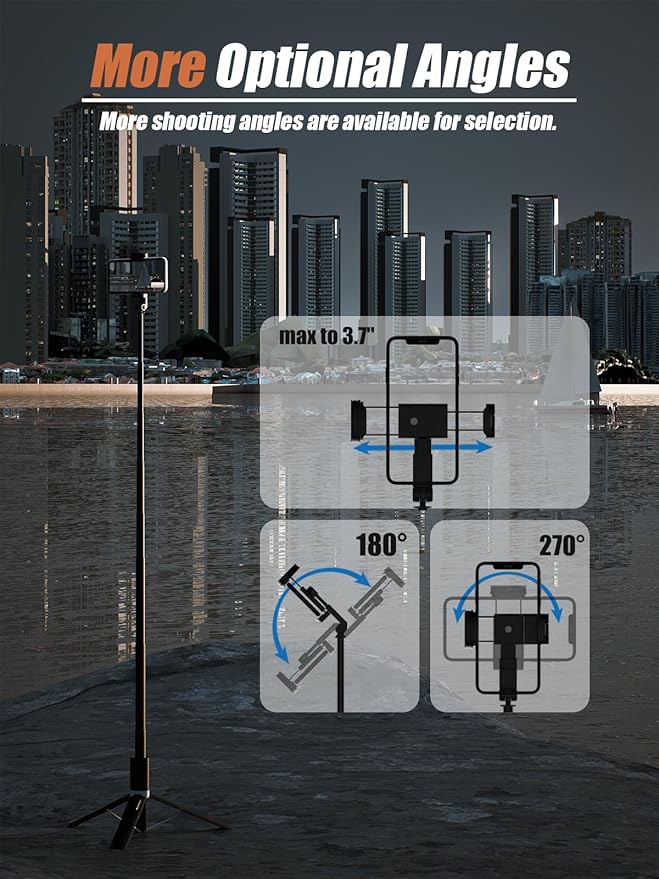 - Selfie Stick Tripod with Remote: Features a detachable Bluetooth remote control with a range of up to 33 feet. Capture shots freely and express your creativity at your own pace – no need for assistance or physical contact with your phone tripod stand