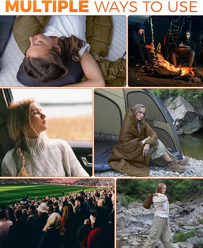 - MULTI-USE FOR ANY OCCASION — OUTDOOR, INDOOR COMFORT WITH PRACTICAL DETAILS: More than just a camping blanket, it works as a picnic mat, shawl, travel pillow, or emergency sleeping bag. Whether you're camping, watching outdoor movies, or relaxing at home, it’s your go-to gear for year-round comfort. The smooth, tightly woven fabric resists pet hair and is machine washable—easy to maintain, even in homes with pets. Lightweight and packable, it's a versatile choice for everyday use and travel.