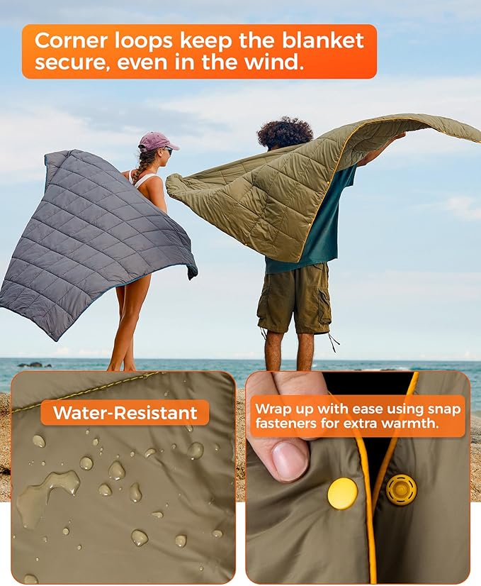 - WATER-REPELLENT & DURABLE FOR UNINTERRUPTED OUTDOOR FUN: Crafted from high-performance 20D ripstop nylon, this camp blanket features a water-repellent coating and reinforced triple-stitched seams. The abrasion-resistant fabric is windproof and sheds light rain, keeping you warm and dry during outdoor activities like watching a football game in the rain. Unlike a rain jacket, it offers both protection and comfort, letting you enjoy the experience without worrying about the cold or getting wet.