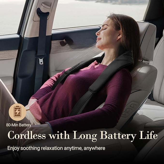 - Cordless & Portable: CuPiLo neck massager for pain relief deep tissue Built-in 2,500 mAh battery delivers up to 80 minutes of cordless massage (with automatic 10-minute shut-off). Slip the shiatsu neck and back massager easily into a travel bag, office tote, home bag or carry-on to enjoy relief anywhere—no outlet required.