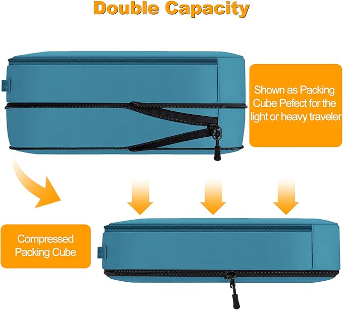 - Enhanced Durability – Heavy-Duty Zippers & Reinforced Handles:Made with high-density, tear-resistant fabric, these packing cubes feature premium dual zippers for smooth and reliable use. The Compression Packing cubes include reinforced handles, making them easy to carry separately or pack into suitcases, carry-ons, duffels, and backpacks!