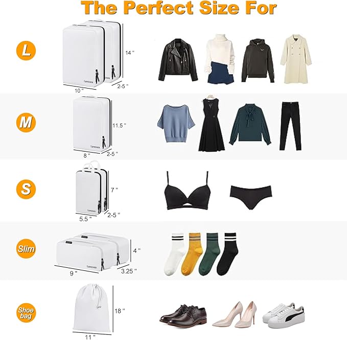 - đŚAdvanced Compression Technology â Saves 50% SpaceďźDesigned with double-layer zippers, these packing cubes compress clothes efficiently, reducing volume by up to 50%. Easily pack bulky items like jackets, sweaters, or workout gear while keeping them neatly organized. Perfect for minimalist travelers, backpackers, and business professionals who need extra space!