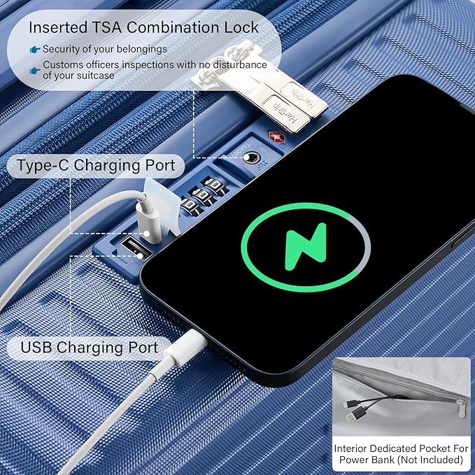 - 【Cup / Phone Holders & 2 Charging Ports】Large suitcases with wheels feature a universal cup holder for most water bottles, coffee mugs and tumblers. Retractable dual hooks securely hold various persoanl items like phone, iPad, U-shape throw pillow, handbag, etc (up to 11 lbs). Built-in charging ports allow on-the-go power access for Type-C / USB devices (portable power bank not included). Multifuncational blue luggage to set your hands free during layover at airport / train station.