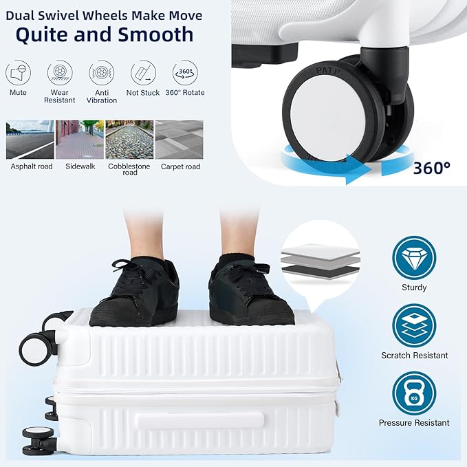 - 【Cup / Phone Holders & 2 Charging Ports】Large suitcases with wheels feature a universal cup holder for most water bottles, coffee mugs and tumblers. Retractable dual hooks securely hold various persoanl items like phone, iPad, U-shape throw pillow, handbag, etc (up to 11 lbs). Built-in charging ports allow on-the-go power access for Type-C / USB devices (portable power bank not included). Multifuncational white luggage to set your hands free during layover at airport / train station.