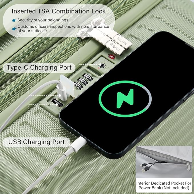 - 【Cup / Phone Holders & 2 Charging Ports】Large suitcases with wheels feature a universal cup holder for most water bottles, coffee mugs and tumblers. Retractable dual hooks securely hold various persoanl items like phone, iPad, U-shape throw pillow, handbag, etc (up to 11 lbs). Built-in charging ports allow on-the-go power access for Type-C / USB devices (portable power bank not included). Multifuncational green luggage to set your hands free during layover at airport / train station.