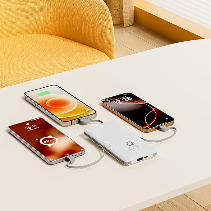 Brand Q 10000mAh Portable Charger with Built-in Cables and AC Wall Plug, USB C Fast Charging Power Bank with 3 Cords,5 Output External Battery Pack Compatible with iPhone,Tablet and All Smart Phones