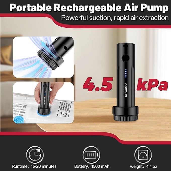 - Powerful 4500Pa suction: Compresses a bag in just about 10 seconds—faster and easier than manual pumps, helping you improve packing and storage efficiency effortlessly.
