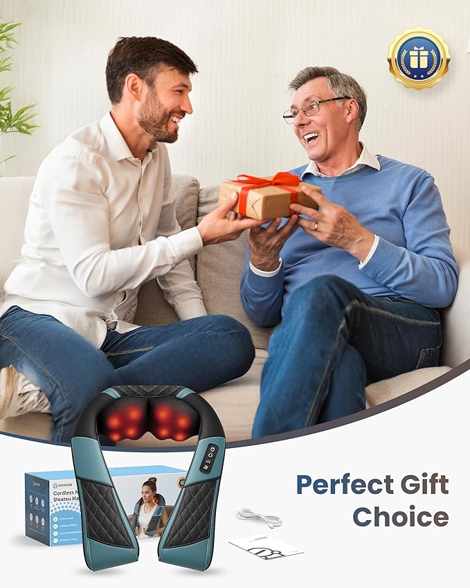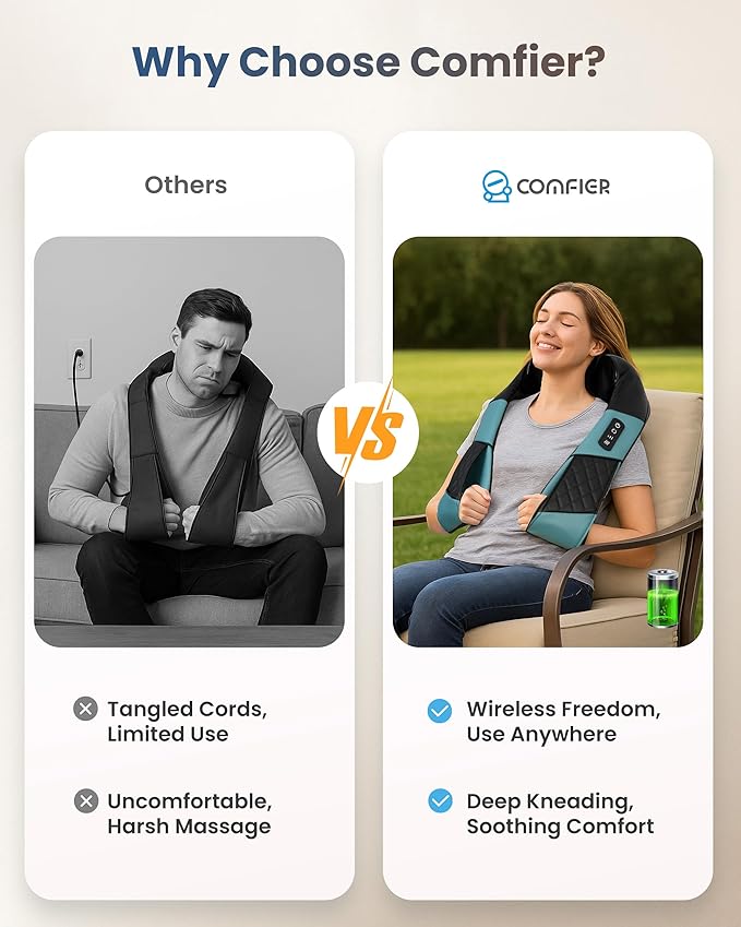 - 【Cordless & Rechargeble—Massage Anywhere】This wireless and rechargeable neck & shoulder massager is equipped with a 2200mAh battery, delivering up to 1 hour of cordless relaxation after just 4 hours of USB-C charging. Weighing only 2.9 lbs, it’s ultra-lightweight and portable—perfect for travel, office breaks, or relaxing at home. Enjoy deep relief from cordless massager wherever you go, without being tied to an outlet.