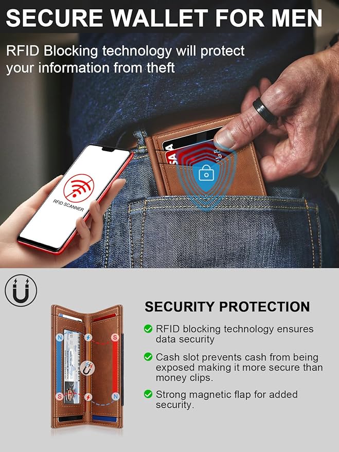 - ULTRA-THIN POCKET WALLET: This rfid wallet for men measures 3.94 x 2.83 x 0.39” and can hold up to 13 cards, fitting perfectly into your front pocket. Its compact design makes it ideal for everyday carry and an excellent travel wallet.