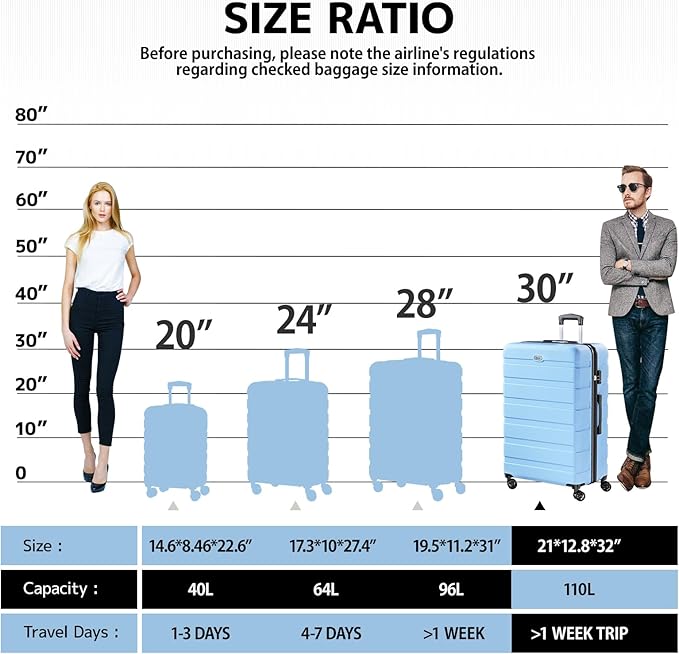 - [Checked-Large 30 Inch] The 30-inch suitcase meets the functions of boarding, travel, and daily storage. Size: 21*12.8*32 inches. Capacity: 110L.