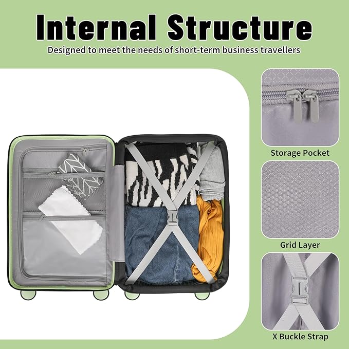 - Front Open Pocket Design: A convenient front-opening pocket with multiple compartments and pockets for organizing electronic devices such as laptops, tablets, and files provides quick access to what you need without having to open your entire suitcase.