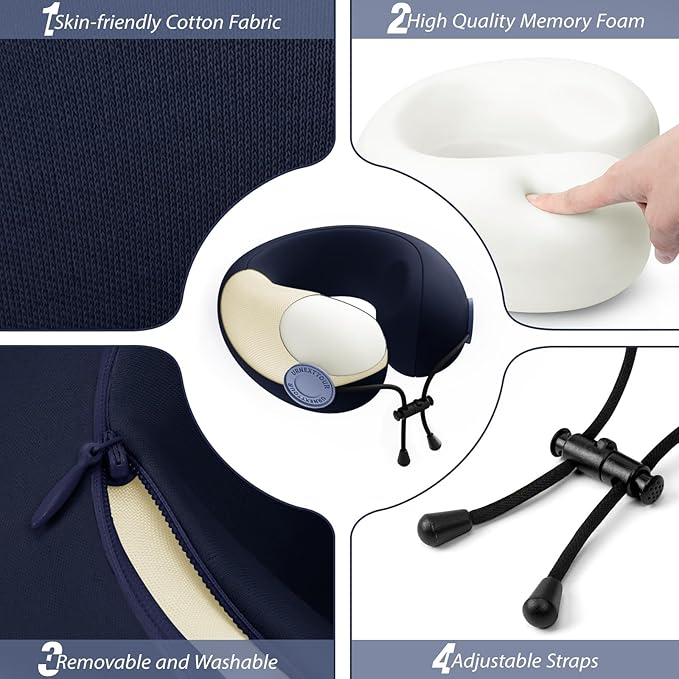Travel Neck Pillows for Airplane Adults, Memory Foam Neck Support Travelling Pillow with Washable Cotton Pillowcases and Storage Bag, for Car, Train, Flight, Office and Home Use Adults Blue