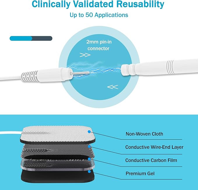 - 【Reusable and Durable】 These high-quality electrode pads are reusable, providing long-lasting performance for your TENS therapy sessions. Our electrical stimulation electrodes are latex free and non-irritating, provide excellent self-stick and conductivity performance for up to 40 uses, which is reusable and easy to clean up. Moreover, those TENS unit pads are easy to remove with no sticky residue left behind.