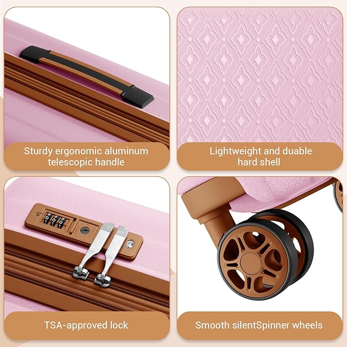 Kono Expandable 24 Inch Hard Shell Travel Luggage, Large capacity for easy travel, Hidden Cup Holder & TSA Lock Lightweight Suitcase - Pink/Brown
