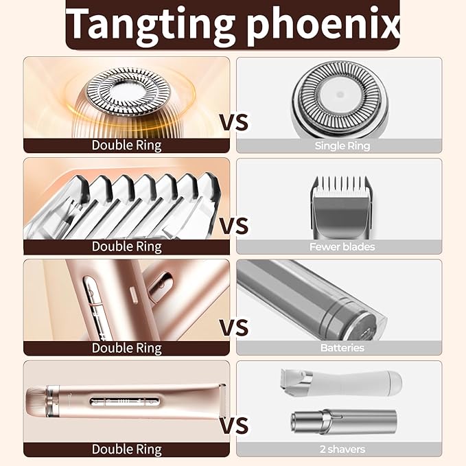 - 【Tangting phoenix 2-IN-1 Electric Shaver & Bikini Trimmer for Women】This electric shaver for women combines two heads: a wide trimmer for bikini lines, underarms, legs, and arms, plus a precision round head for face hair removal. Switch modes instantly with no blade changes.