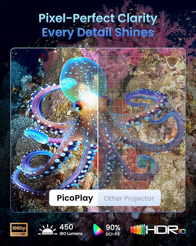 - ๐๏ธ๐-๐ข๐ง-๐ ๐๐ง๐ญ๐๐ซ๐ญ๐๐ข๐ง๐ฆ๐๐ง๐ญ ๐๐ฎ๐: PicoPlay+ integrates a mini projector, immersive Bluetooth speaker, and dynamic ambient light (with Optical Filter). Easily switch between modes to create the ultimate vibe for movie nights, house parties, or chill music sessions with friends.