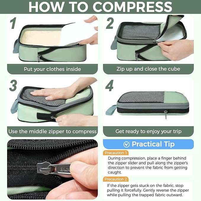 - HOW TO MAKE THE COMPRESSION HAPPEN? - There Is a Extra Zipper Outside Of Our Compression Packing Cubes Which Can Be Zipped Up To Flatten The Cubes And Save The Space As Far As Possible. It Just Works Like a Vacuum Sealer. You Just Need To :1) Fold Your Clothes And Flatten Them 2)Pack Clothes In The Cubes And Zip The Normal Zipper. 3)Put A Finger On The Back Of The Zipper In The Space When Compressing The Packing Cubes In Case The Zipper Get Stuck In Fabric.
