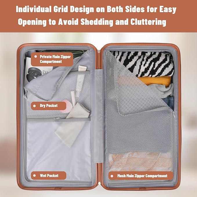 - Individual Grid Design: The internal structure of both luggages features a zippered divider on both sides, a design that is easy to open and does not cause detachment and clutter when the suitcase is sliding around.