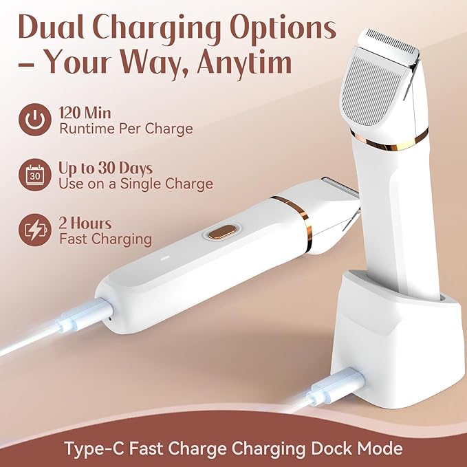 - ⥠USB-C Fast Charging & Convenient Dock: This electric razor for women features a modern USB-C fast charging system and a convenient charging dock. A full 2-hour charge delivers up to 90 minutes of continuous use, making it perfect for home grooming or travel touch-ups. Forget battery hassles â stay ready anywhere.