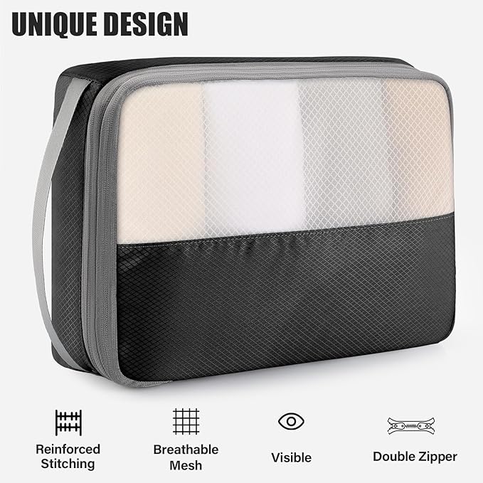 - Maximize Packing Space: Excellent space-saving design to hold more items efficiently! With a compression zipper design that saves up to 50% of storage space, you can pack more in your suitcase. The packing cubes for travel help squash clothes down and securing clothing inside to prevent shifting.