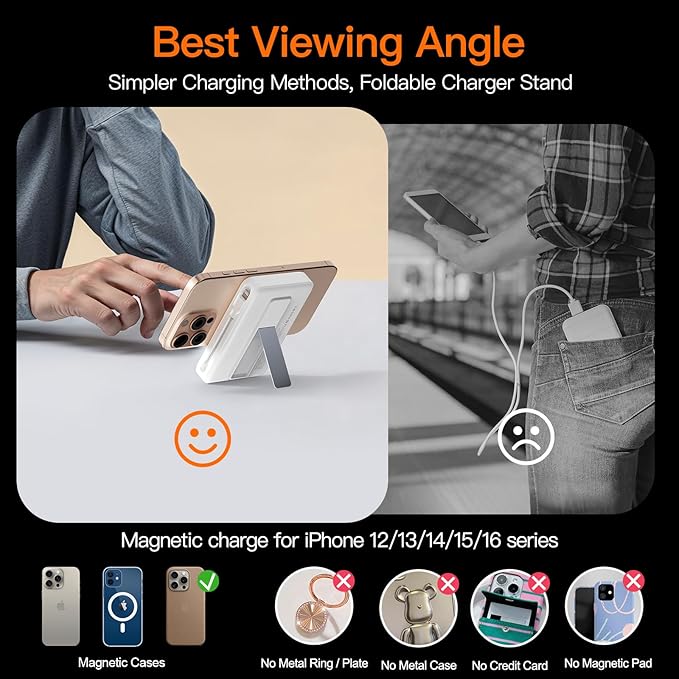 - Strong magnetic attraction:Equipped with a built-in powerful N52 magnetic coil, designed specifically for Magsafe battery packs, perfectly aligned with the Magsafe iPhone 17/16/15/14/13/12 series. Even during outdoor activities, it will firmly adhere to the phone without slipping off, ensuring your safety. When charging, simply lightly align the phone magnetic coil with the battery pack for wireless charging