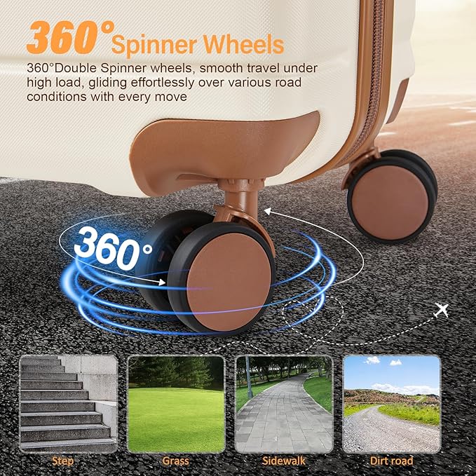 - 【360° Smooth Spinner Wheels】:luggage sets with 8 spinner wheels use high flat and straight shock-absorbing universal wheels to make their travel luggage sets quieter and smoother, ensuring 360° free rotation, Thanks to the smooth-rolling wheels of suitcase, even when fully loaded, it's a breeze to maneuver through crowded airports and busy streets without feeling fatigued or strained.