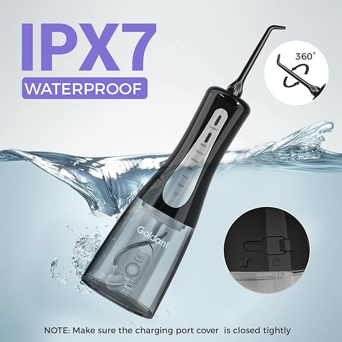 - 【Travel bag design and IPX7 waterproof】The rechargeable water flosser comes with a travel bag, is cordless and lightweight. Portable water flosser takes 3-hours full charge and lasts 30 days per charge, suitable for travel, outdoor activities and home use; With a IPX7 waterproof feature,water flosser cordless is safe to rinse under water and shower in bathroom when the charging port is securely covered