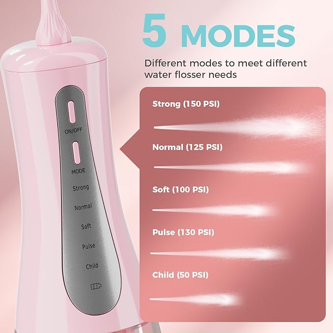 - 【350ML large water tank and 5 adjustable modes】The 350ml large water tank ensures sufficient and uninterrupted oral cleaning without repeated water addition.Picks for teeth cleaning and flossing provides five modes including Strong,Normal,Soft,Pulse and Child modes.It is recommended to select "Child" mode for the first time use