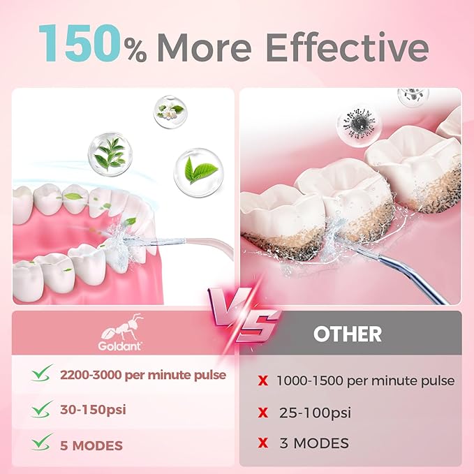 - 【Powerful water flossing】The water flosser adult provides a strong water flow of 2200-3000 per minute pulse, 30-150PSI adjustable strong water pressure, effectively removes dental plaque, thoroughly removes food debris and stains between teeth and below the gum line, and meets various dental cleaning needs