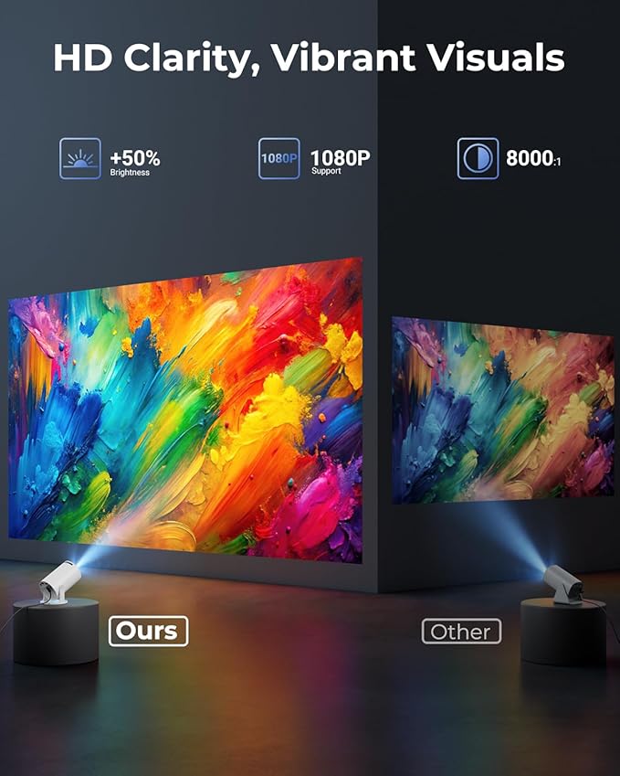 - Smooth Wireless Streaming with Wi-Fi 6 & Bluetooth 5.2: This mini projector supports fast, stable screen mirroring from iPhone, Android, tablet, and laptop via advanced Wi-Fi 6. Bluetooth 5.2 enables instant pairing with speakers for synchronized audio. No more messy cables—enjoy wireless freedom and immersive home theater experiences anywhere