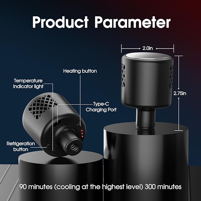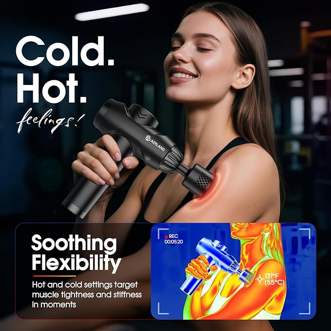 - Hot and Cold Deep Massage: This percussion massage gun features three adjustable heat and cool settings (cold: 44°F-50°F-55°F) (hot: 113°F-122°F-131°F), allowing you to tailor the experience to your preferences for optimal post-workout recovery and relaxation